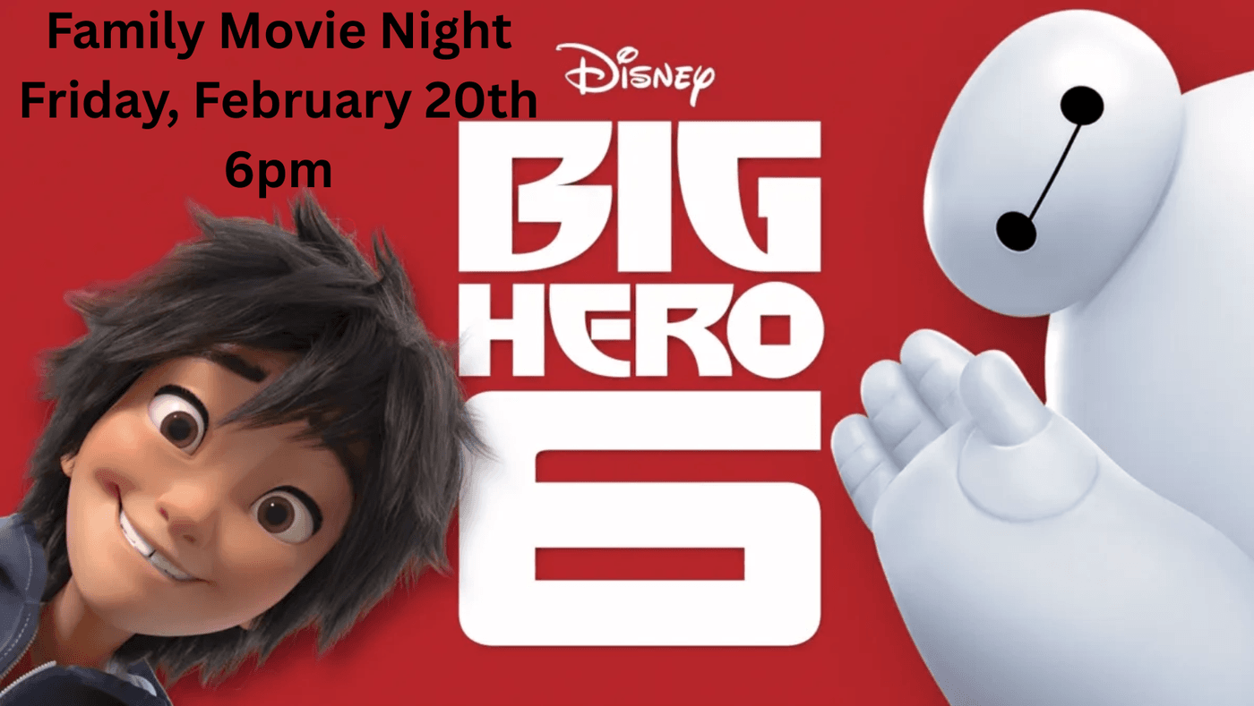 Join us for a fun night at the church to watch Big Hero 6! As always, we'll provide the popcorn and snacks. You just need to bring a drink and something to sit on. We hope you can join us!